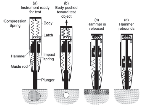 هنگامی که پلانجر آزاد می شود شاخص اندازه گیری روی نشانگرعدد برگشتی ده را نشان میدهد. پلانجر آزاد بصورت عمود روی سطح بتن قرار داده شده و با نیروی کافی به داخل بدنه هل داده شود سپس بعد از ضربه زدن برای قرائت شاخص دکمه ضامن (Locking button)فشرده شود. فنر جهنده(Impact Spring)، فنر تراکم(Compression Spring) و وزنه فشرده شده و به یک قلاب (Release catch) به بالای چکش چفت میشود. بعد از چفت فنر تراکم به قلاب، فاصله برگشتی بر روی نشانگر (Window & Scale) از 10 تا 100 اندازه گیری شده و به عنوان عدد بازگشت ثبت می شود. عدد بازگشتی به سختی سطح مربوط میشود. بنابراین انرژی جذب شده با مقاومت بتن هم مرتبط است. بتن کم مقاومت و سختی کم انرژی بیشتری نسبت به بتن با مقاومت بالا و سختی بالا جذب می کند. در نتیجه، بتن کم مقاومت منجر به عدد برگشتی کمتری خواهد شد.